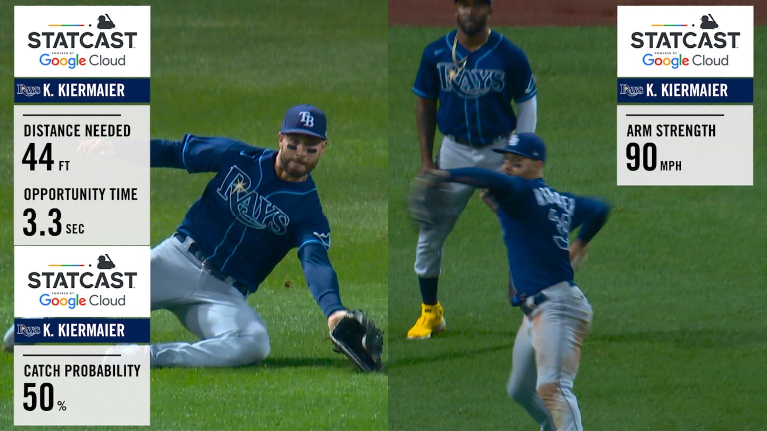 Statcast measures the distance needed, opportunity time and catch probability of Kevin Kiermaier's sliding grab, and his 90 mph clutch throw